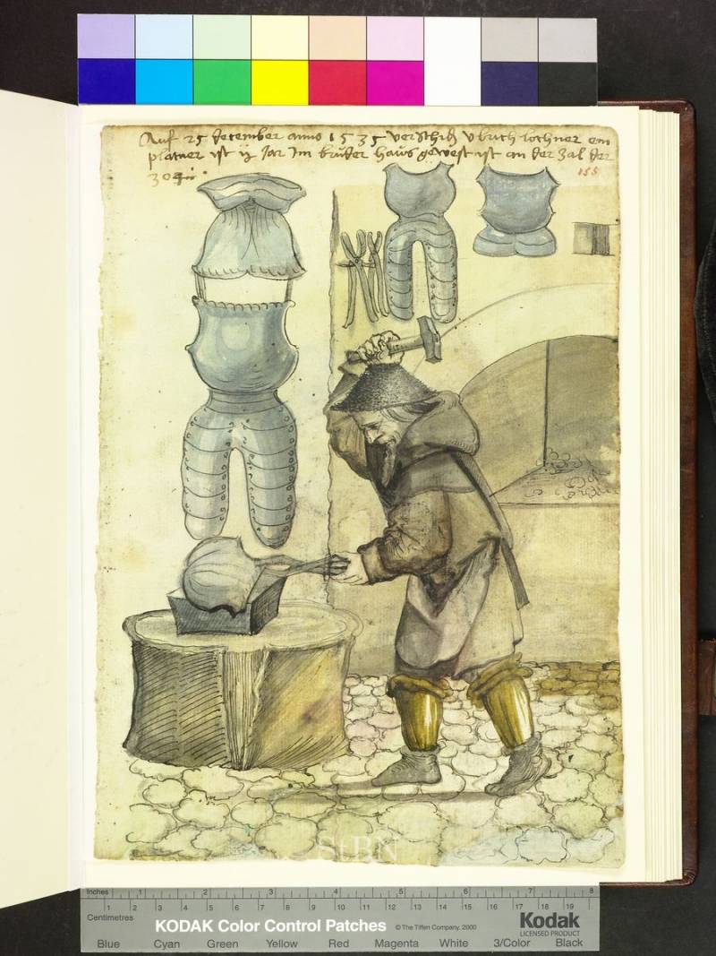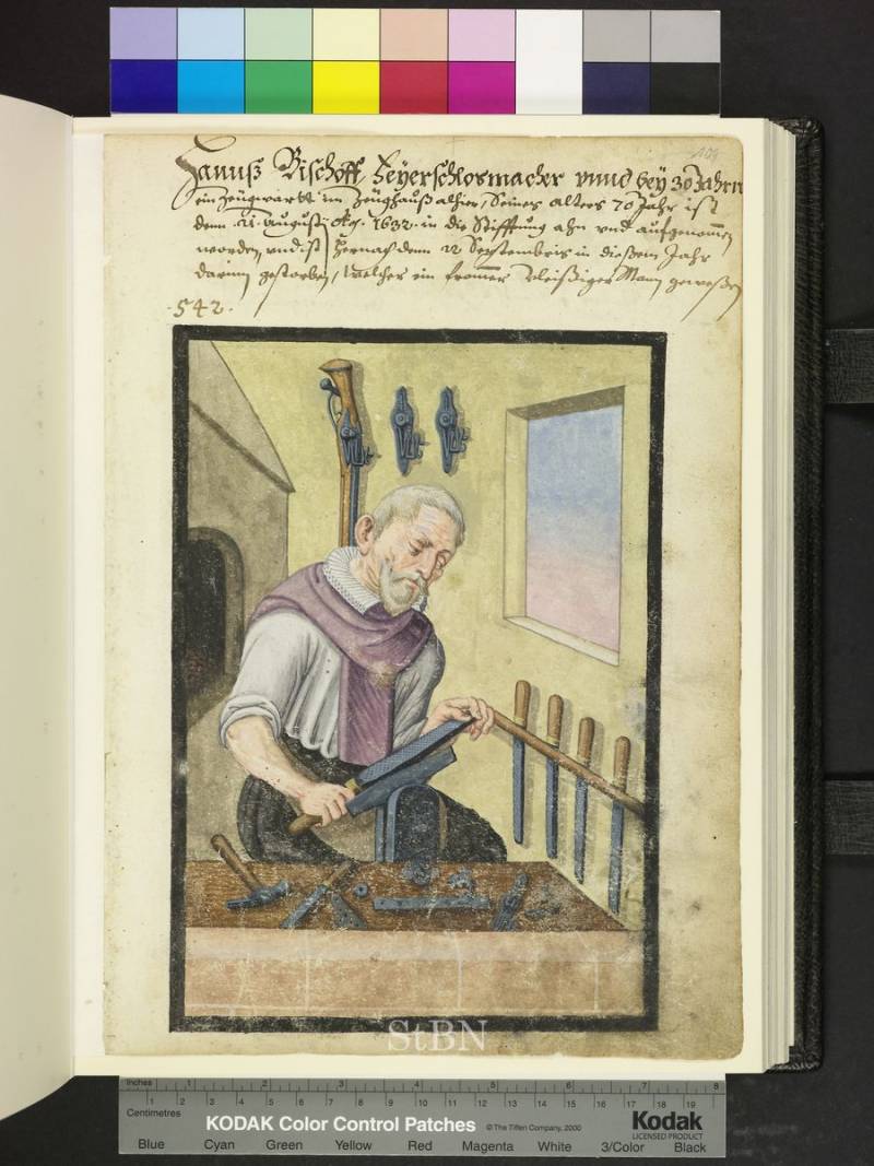 ». Люди не жили, а выживали, да и ещё вдобавок массами мёрли от чумы. Так что ничего хорошего в ту эпоху вроде бы не было. Но… если люди только тем и занимались, что воевали и грабили, то… когда же они создавали всё то, что потом разграблялось? Следовательно, и воевали не всё время, да и время на производительный труд оставалось, не так ли?Средневековье – это мир каменных замков, которых в Европе построено более 15 000. Но ведь кто-то же их строил, и кто-то кормил тех, кто строил? А ещё в Европе строились города и соборы, и ведь опять-таки этих людей нужно было кормить. Допустим, что крестьяне в деревнях сами шили себе одежду. Но тем же самым строителям одежду кто-то должен был шить! Носили покупную одежду (и обувь) горожане, как торговцы, так и ремесленники, носили её их жены, прислуга, наёмные солдаты, оберегающие покой горожан. Людям требовались перчатки, кошельки, конская упряжь, сёдла для лошадей, посуда и женские украшения, сундуки и стулья, лавки и двери, а ещё замки к этим дверям, петли, на которые их вешали, иголки и нитки, прялки и ткацкие станки. Словом, всем тем, кто жил в эпоху Средневековья, требовалась масса самых разных вещей, которые должны были производить люди самых разных специальностей.До нашего времени сохранилась «Книга ремёсел» 1263 года, в которой описываются требования к ремесленникам города Парижа и приводятся законы, регулирующие их деятельность. Так вот, из неё становится ясно, что в это время в Париже существовало более 100 самых разных цехов, объединяющих самых разных производителей, выпускавших тысячи наименований товаров. Причём с каждым годом и цехов, и производимых ими товаров становилось всё больше! А всё потому, что рыночные отношения мало-помалу развивались, и совершенствовались орудия труда.То есть можно вполне доказательно утверждать, что Средневековье было временем трудолюбивых и мастеровитых людей, которые даже при помощи самых простых инструментов могли создавать (и создавали!) массу прекрасных вещей, начиная от самых простых бытовых предметов утилитарного предназначения и вплоть до настоящих шедевров, сделанных из золота и серебра и украшенных драгоценными камнями.Однако можно ли сегодня познакомиться с работой тогдашних мастеров-производителей поближе и, прежде всего, посмотреть на них, чтобы иметь возможность представить себе их облик и то, как они в то далёкое время работали? Оказывается, такая возможность у нас сегодня есть. А всё благодаря одному очень важному событию, имевшему место в городе Нюрнберге в 1425 году. А было так, что богатый нюрнбергский торговец Конрад Мендель-старший (Мендель-младший в 1380 году основал монастырь) учредил благотворительное заведение – «Дом двенадцати братьев». Называлось оно так потому, что него приняли двенадцать нюрнбергских мастеров, которые ещё могли работать, но в силу своего возраста и состояния здоровья сами себя обеспечить уже не могли. То есть «неквалифицированную рабочую силу» в это братство не принимали. Не принимали в него и священнослужителей. Кроме того, надо было быть гражданином Нюрнберга не менее десяти лет.Затем, уже в 1501 году по образцу и подобию предыдущего ещё один «Дом двенадцати братьев» учредил другой нюрнбергский торговец – Маттеус Ландауэр-младший. И вот и в первом, и во втором «домах» братства стали вести книги, в которых изображались т